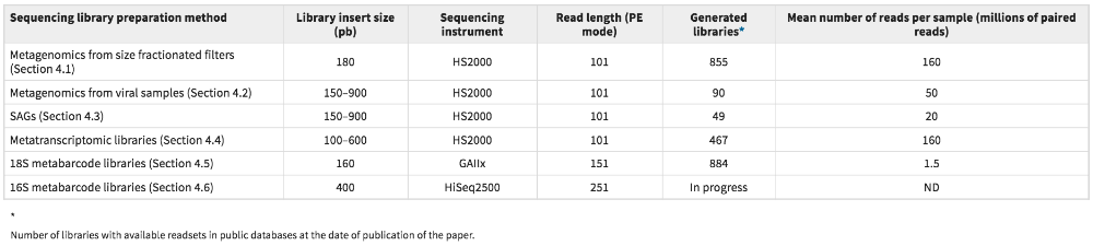 Protocol Citation: Adriana Alberti, Julie Poulain, Stefan Engelen, Karine Labadie, Sarah Romac, Isabel Ferrera, Guillaume Albini, Jean-Marc Aury, Caroline Belser, Alexis Bertrand, Corinne Cruaud, Corinne Da Silva, Carole Dossat, Frédéric vory, Shahinaz Gas, Julie Guy, Maud Haquelle, E'krame Jacoby, Olivier Jaillon, Arnaud Lemainque, Eric Pelletier, Gaëlle amson, Marc Wessner, Genoscope Technical Team, Silvia G. Acinas, Marta Royo-Llonch, Francisco M. Cornejo-Castillo, Ramiro Logares, Beatriz Fernández-Gómez, Chris Bowler, Guy Cochrane, Clara Amid, Petra Ten Hoopen, Colomban De Vargas, Nigel Grimsley, Elodie Desgranges, Stefanie Kandels-Lewis, Hiroyuki Ogata, Nicole Poulton, Michael E. Sieracki, Ramunas Stepanauskas, Matthew B. Sullivan, Jennifer R. Brum, Melissa B. Duhaime, Bonnie T. Poulos, Bonnie L. Hurwitz, Stéphane esant, Eric Karsenti, Patrick Wincker 2020. Sequencing and data quality control. protocols.io https://dx.doi.org/10.17504/protocols.io.qwjdxcn Manuscript citation: Alberti, A. (2017). Viral to metazoan marine plankton nucleotide sequences from the Tara Oceans expedition. Scientific Data 4, 170093 (2017)